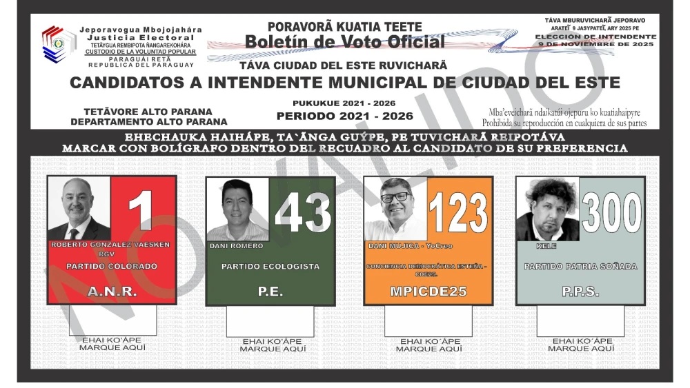 CIUDAD DEL ESTE (locales) El Tribunal Superior de Justicia Electoral (TSJE) publicó este domingo el modelo de boletín de voto, en cumplimiento al artículo 173 de la ley 834/96 y al Cronograma Electoral para la elección de intendente de Ciudad del Este, Departamento de Alto Paraná, prevista para el próximo domingo 9 de noviembre.