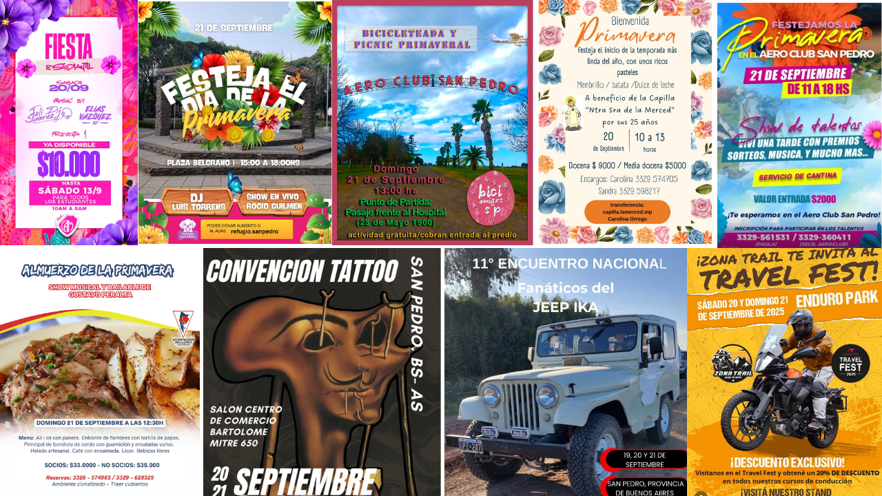 SAN PEDRO (enviado especial) Este fin de semana, del viernes 19 al domingo 21 de septiembre, el Departamento de San Pedro se llena de vida con una serie de actividades que celebran la primavera, el Día del Estudiante y el talento local. Desde exposiciones de tatuajes hasta festivales musicales y encuentros de fanáticos del automovilismo, hay propuestas para todos los gustos en distintas ciudades del segundo departamento.